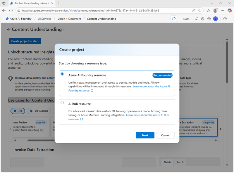 In the Content Understanding page, select Create a project to start. Then in the Create project dialog, select the recommended resource type (Azure AI Foundry resource):