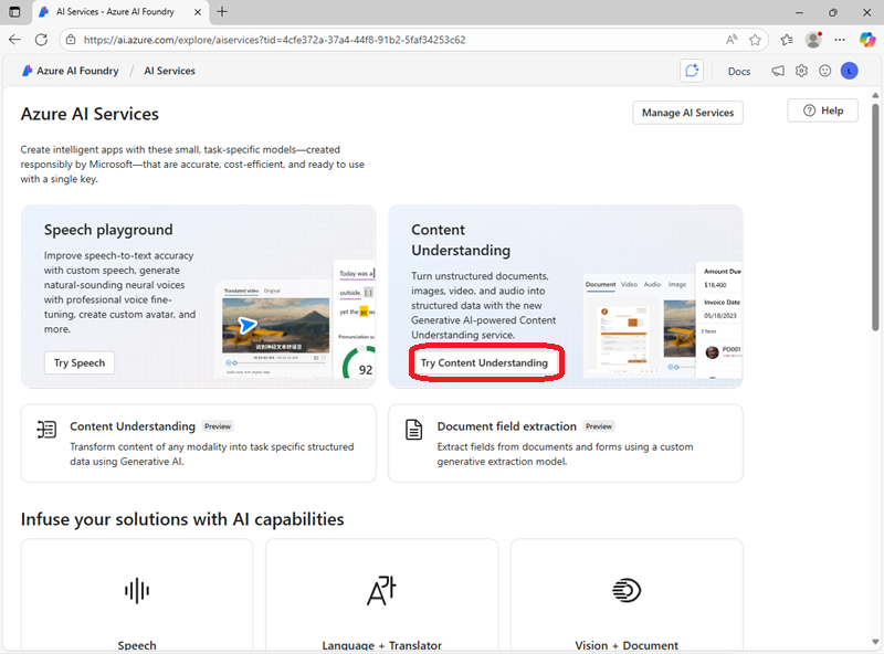 On the Azure AI Services page, select Try Content Understanding.
